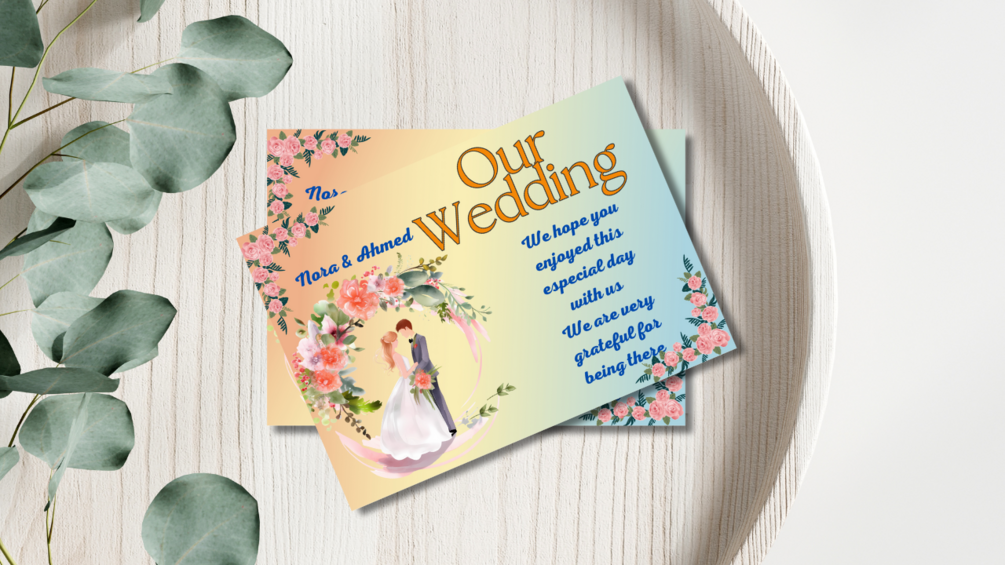 "A romantic wedding thank-you card template featuring a lovely floral wreath, a bride and groom illustration, and elegant text. Perfect for expressing gratitude to guests for attending your special day."